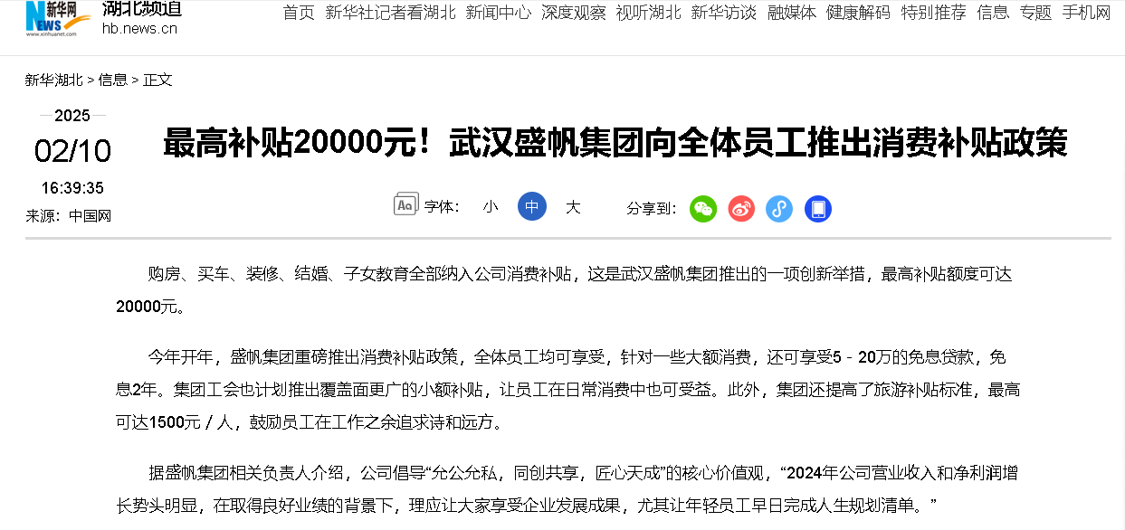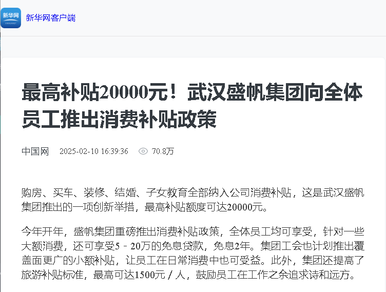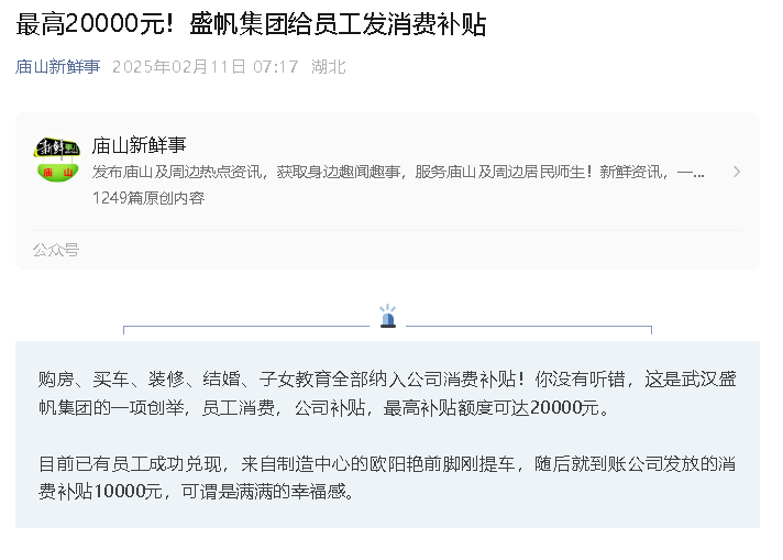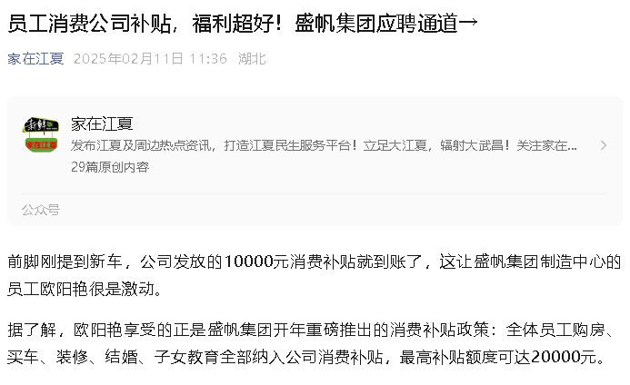購房、買車、裝修、結(jié)婚、子女教育全部納入公司消費補貼,這是武漢盛帆集團推出的一項創(chuàng)新舉措,最高補貼額度可達20000元···