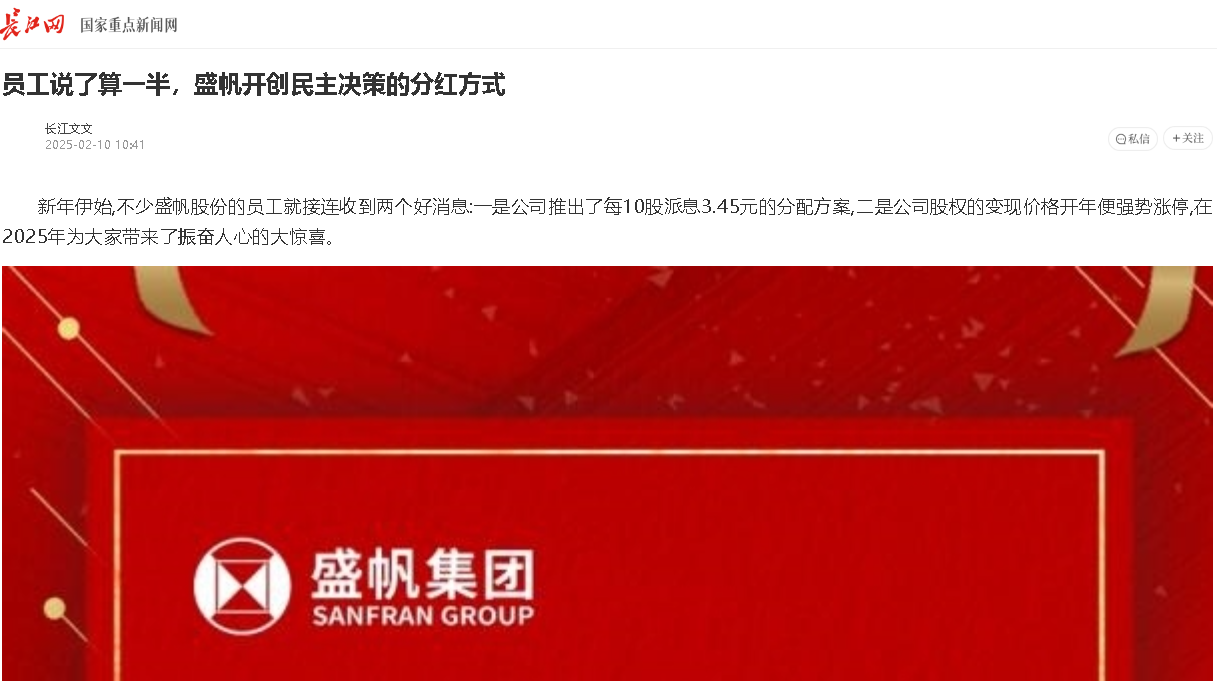 新年伊始,不少盛帆股份的員工就接連收到兩個好消息:一是公司推出了每10股派息3.45元的分配方案,二是公司股權(quán)的變現(xiàn)價格開···