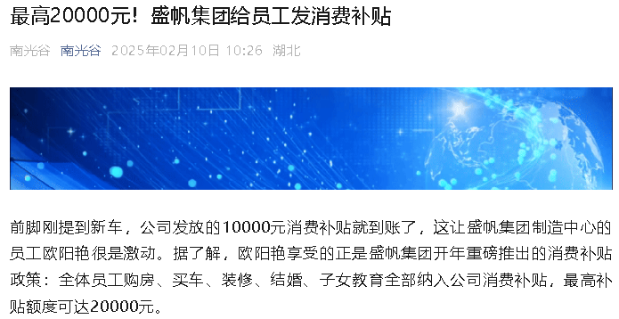 前腳剛提到新車,公司發(fā)放的10000元消費補貼就到賬了,這讓盛帆集團制造中心的員工歐陽艷很是激動。據(jù)了解,歐陽艷享受的···