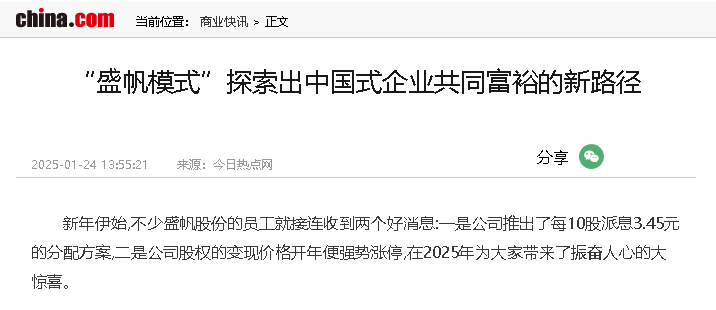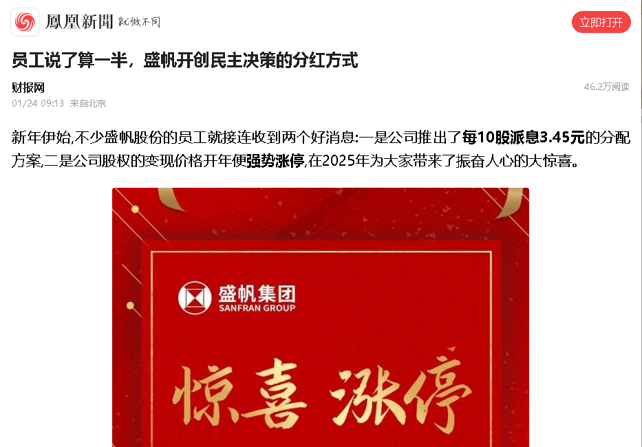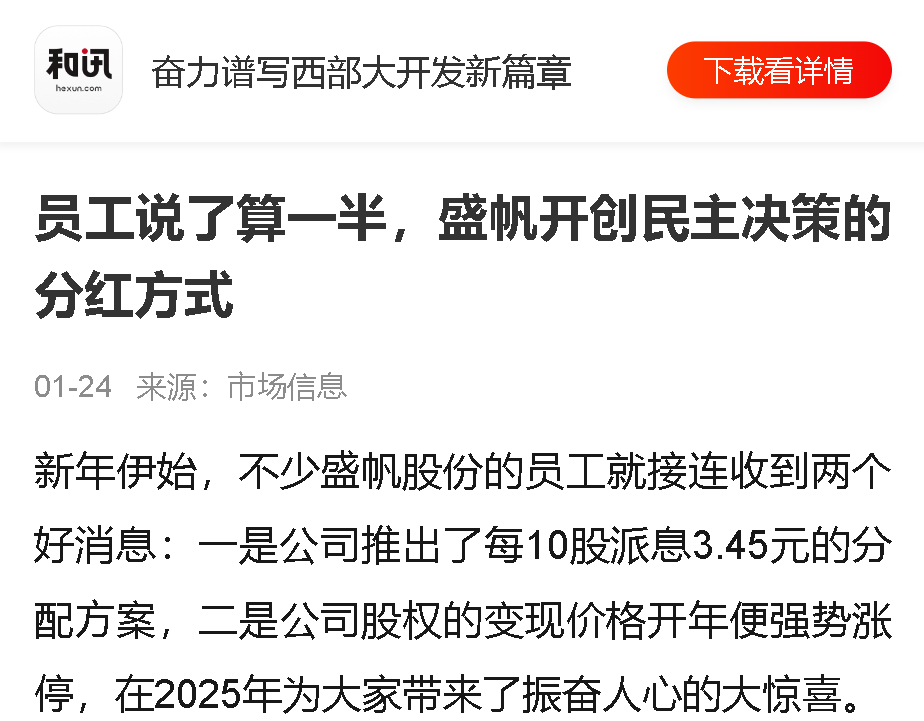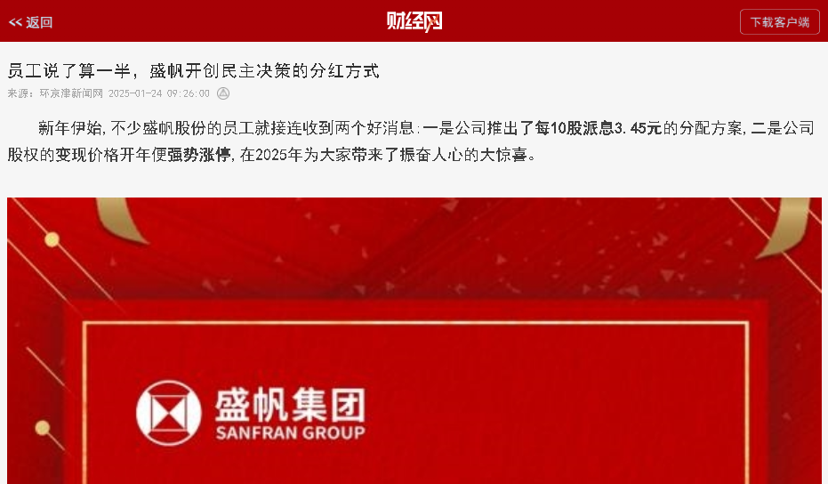 新年伊始,不少盛帆股份的員工就接連收到兩個好消息:一是公司推出了每10股派息3.45元的分配方案,二是公司股權(quán)的變現(xiàn)價格開···