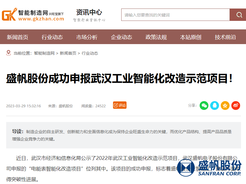 近日,武漢市經(jīng)濟(jì)和信息化局公示了2022年武漢工業(yè)智能化改造示范項(xiàng)目,武漢盛帆電子股份有限公司申報(bào)的“電能表智能化改···