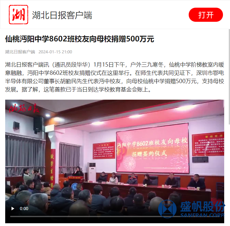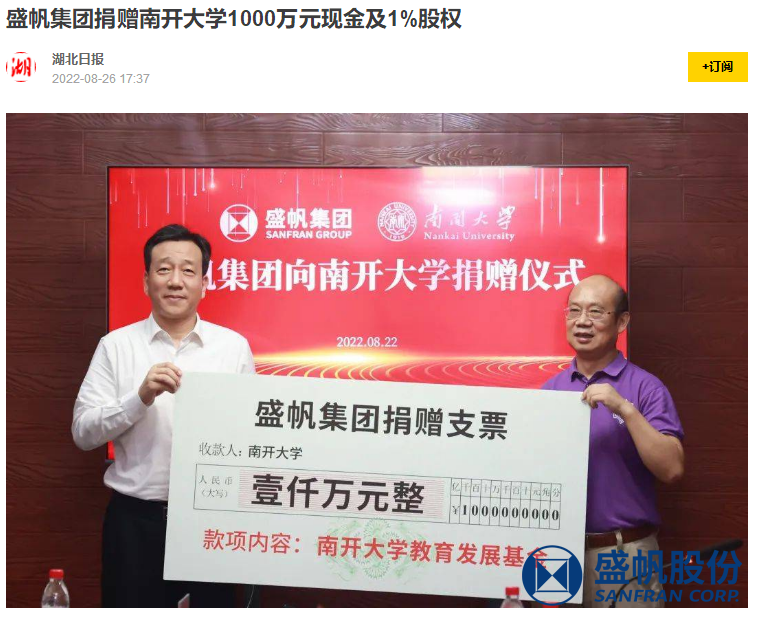8月22日,盛帆集團(tuán)與南開(kāi)大學(xué)在武漢簽署捐贈(zèng)協(xié)議,盛帆集團(tuán)向南開(kāi)大學(xué)捐贈(zèng)1000萬(wàn)元現(xiàn)金和1%股權(quán),雙方開(kāi)啟深度合作。盛帆···